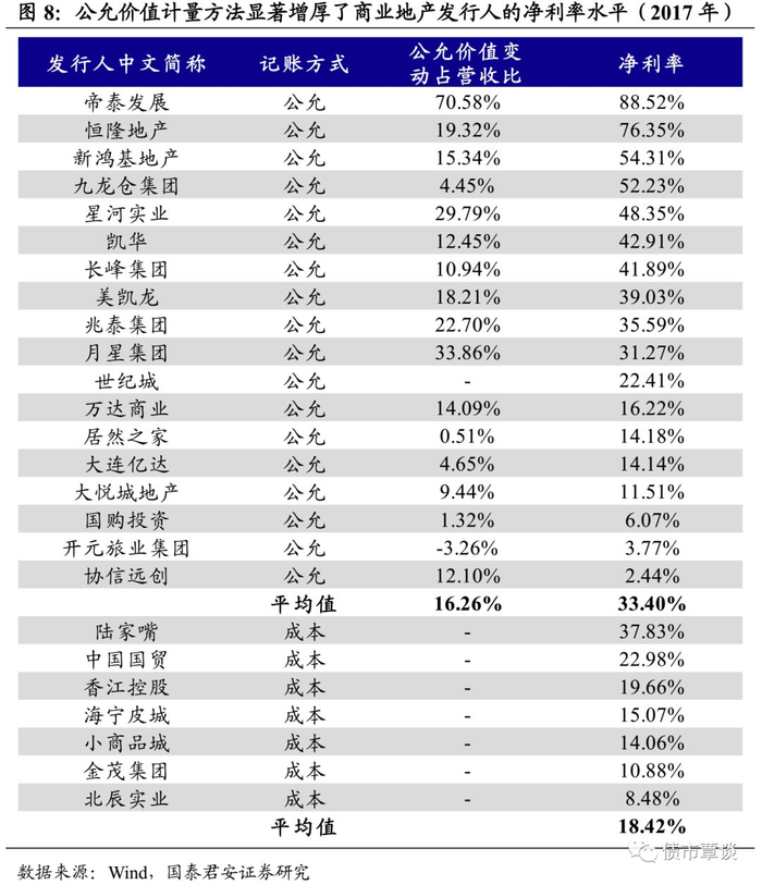 受公允价值变动损益影响,公允价值计量模式下账面盈利能力更强。在成本模式下,房企将拥有的投资性房地产以开发成本入账,每年对其计提折旧。此外,每年还要对其进行减值测试,如确认发生减值则应计提相应的减值准备。而在公允价值模式下,房企在每个会计期末都将对持有的投资性房地产进行计量,按照所得的公允价值入账。公允价值的变动计作公允价值变动损益科目,影响当期损益。在地产价值持续增长的环境下,公允价值变动损益往往是当期损益的重要影响因素。投资性房地产采取公允价值计量模式的18家样本房企,其平均净利率为33.4%,但若扣除公允价值变动损益的影响,这一指标将减少为17.14%,与成本计量模式下房企净利率18.42%大体相当,公允价值损益变动几乎影响了其净利率一半的水平。