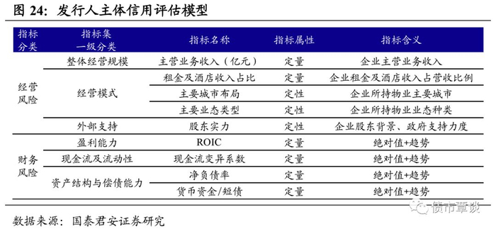 评分模型:基于评分模型对28家商业地产发行人信用资质进行排序。模型的经营指标包括规模、经营模式、外部支持等因素;财务指标包括盈利、现金流和资本结构及偿债能力三个部分,具体评分结果见正文。