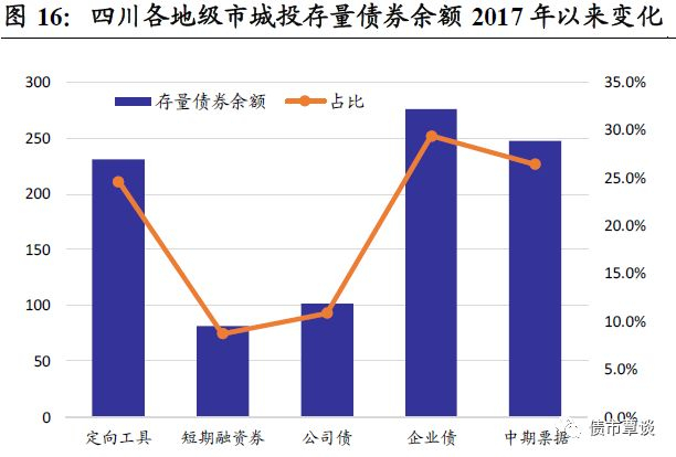 从存量债券类型看,以定向工具、中票和企业债为主,分别为32只、31只和29只,存量余额分别为230.8亿、247.8亿和275.6亿,占比分别为24.6%、26.4%和29.4%,此外,公司债和短融各13和11只,余额合计占19.5%。