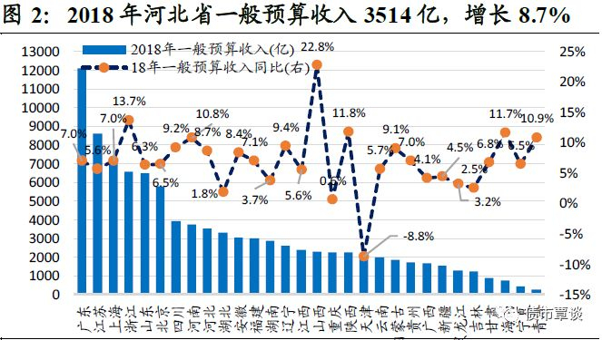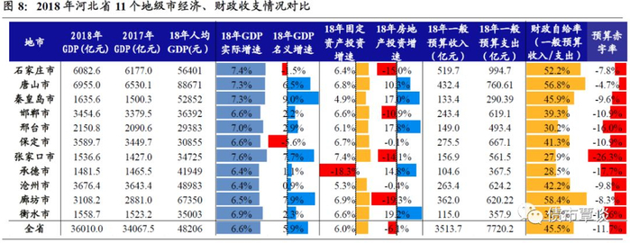 从地方财政实力看,①石家庄市财政实力最强,18年一般预算收入为519.7亿,其次唐山市和廊坊市分别为432.4亿和362亿,保定、沧州和邯郸市在240-280亿区间,而秦皇岛、邢台、张家口、承德、衡水市则均在100-200亿区间,财力相对偏弱;②以“一般预算收入/支出”衡量的财政自给率看,廊坊、唐山和石家庄市最高,均为在50%以上,而张家口市、承德市最低,均在30%以下。③以“(地方预算收入-支出)/GDP”衡量的预算赤字率看,张家口市最高为-26.3%,承德、衡水和邢台也均在-15%以上;而唐山、石家庄和廊坊市预算赤字率最小,均不足8.5%。
