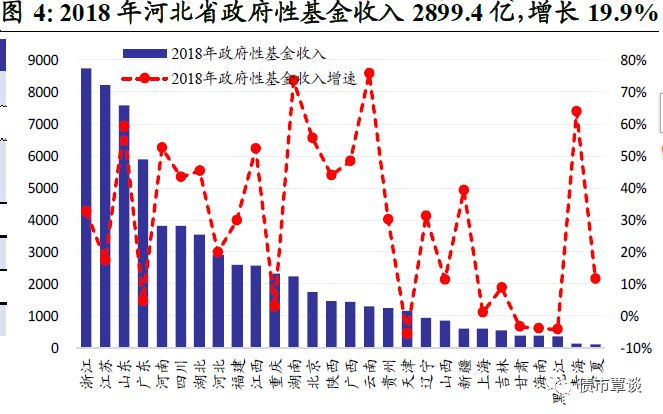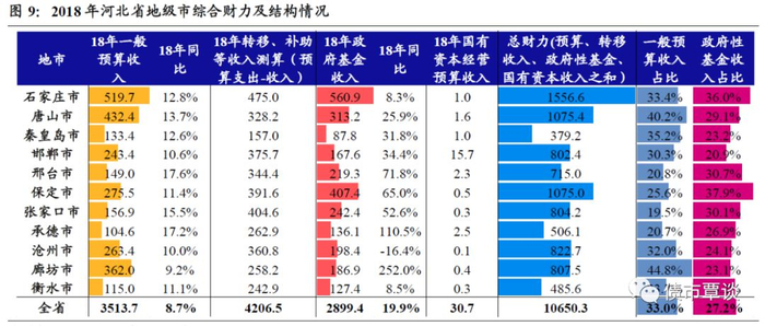 从地方综合财力和来源结构看,①省会石家庄市排名第一,地方综合财力测算值为1556.6亿,其次为唐山市和保定市,均为1075亿左右,而秦皇岛、衡水和承德市地方综合财力相对偏弱;②保定市、张家口市、邢台市、石家庄市、承德市和衡水市18年政府性基金收入规模超过一般预算收入,显示对土地出让收入依赖性较强。③从一般预算收入在综合财力占比看,廊坊市、唐山市财政自给率相对较高,一般预算收入占40%以上,张家口市、承德市最低,分别占19.5%和20.7%。