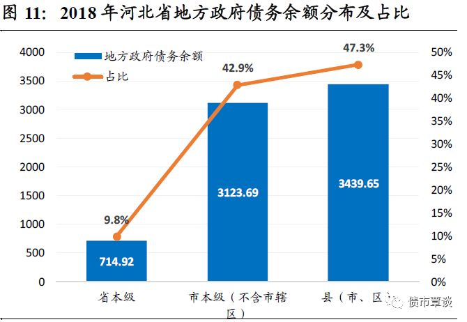 从地方债务水平看,截止2018年末,河北省地方政府债务余额为7278.26亿,同比增长18.3%,地方债务限额为8521亿,尚未使用额度和占比为1242亿和14.58%,对存量城投有息负债的覆盖率为30.37%。全省地方债务余额/GDP为20%,地方债务余额/地方综合财力为68%。从结构看,省本级、市本级(市辖区)、县市区地方债务余额分别为714.9亿、3123.7亿和3439.65亿,占比分别9.8%、42.9%和47.3%。