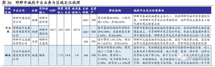 邯郸市市本级平台共3家,主体评级AA+级2家、AA级1家,其中,邯郸城市发展投资集团有限公司和邯郸市建设投资公司承担邯郸市城市基建投融资,邯郸市交通建设有限公司则主要负责交通基建投融资。区县级平台1家,主体AA级,为河北中岳城市建设投资有限公司,主要承担磁县基础设施项目投融资和建设任务。
