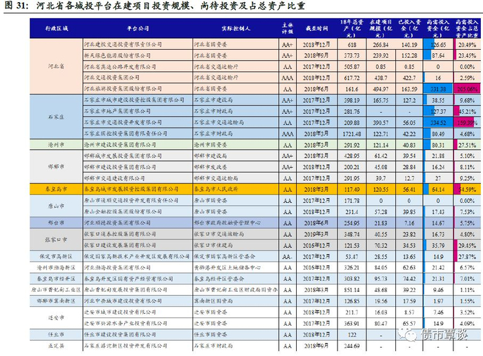 我们根据发行主体18年评级报告等,汇总了地级市、区级平台的在建项目总规模、已投入资金、尚待投资资金需求占总资产比重,可以看出,河北各城投平台总体尚需投入资金占总资产比重较低,总体融资压力较小。