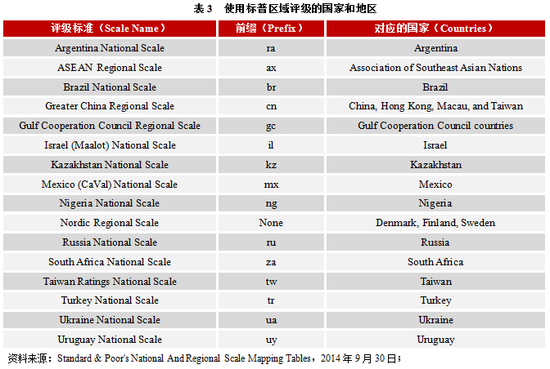 与穆迪公司类似,标普在进入其他国家评级市场时,也会根据所在国实际情况,选择使用全球评级标准或制定本地化评级标准。在制定本地化评级标准时,标普通常会首先确定被评级方在全球标准下的信用级别,然后使用映射表来显示全球和国家范围间的关系,以确定全国范围的信用评级。同时,由于映射关系的存在,全球标准下评级结果的较小变化可能会在映射过程中被放大。因此,随着所在国情况变化,标普使用的本地化评级标准可能产生频繁的调整,并导致级别符号的变动,使得本地化评级标准相对与全球标准来讲比较不稳定。截至2014年9月,标普已制定了针对16个国家(地区)的评级映射表。