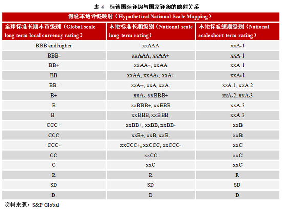 在构建映射表时,标普对评级量表的顶部和底部做出了一定的指导。标普通常要求将“BB-”作为全球尺度评级中映射到“xxAAA”国家尺度评级的最低级别。作为特例,一些获得“xxAAA”评级的个体也可能获得高于其所在国主权级别的全球信用等级。为保证不同主体间信用质量的有效区分,标普将定期或不定期进行本地化评级标准的调整。此外,当下述情况发生时,标普也将重新调整本地化标准:改变主权信用评级时,特别是多级调整发生时;当一般信贷条件发生变化时,例如由于非主权国家风险的变化;当标普改变全球范围内的信用评级定义时。