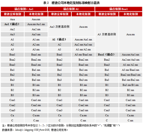 穆迪在设置全球评级标准与本地化评级标准映射时主要有两个步骤,即设置信用锚点级别和进行低于锚点级别的级别映射。穆迪主要采用两种映射方法:对于评级样本较少(低于60个)的国家,穆迪采用“标准映射”方法。在“标准映射”方法中,每个不同的锚点级别均设置有一个映射关系表,直接设置全球评级符号与本地化评级符号的映射关系;对于评级样本较多(超过60个)的国家,穆迪可以通过较为丰富的地区性数据对映射关系进行调整,这种映射方法被称为“进阶映射”方法。