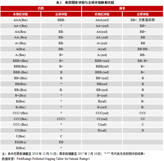 目前惠誉就巴西和南非两国的国家评级实践,出具了针对这两个国家的级别映射表。映射表反映了与国家评级相对应的全球评级的中位值。