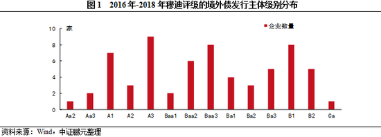 2016年至2018年间,发行过境外债并得到穆迪全球评级的境内发行主体共有64个。从级别分布来看,64个发行主体的信用等级分布在Aa2至B2这13个连续的信用级别中。其中,获得A1、A3、Baa3和B1四个级别的发行主体数量较多,占比在10%以上。