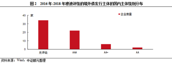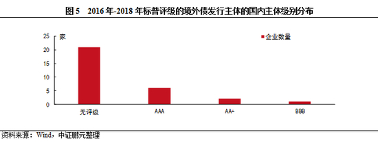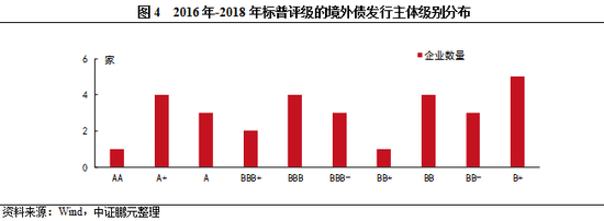 2016年至2018年间,发行过境外债并得到标普评级的境内发行主体共有30个,样本数量较小。从级别分布来看,30个发行主体的信用等级分布在10个信用子级别中,涵盖了AA级别、A级别、BBB级别、BB级别和B级别五个大级别,分布比较均匀,表现出一定的信用风险区分度。