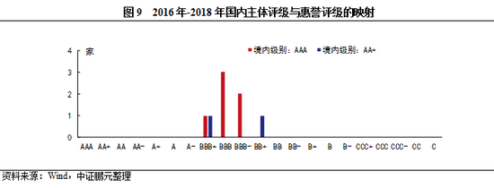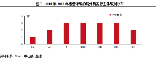 2016年至2018年间,发行过境外债并得到惠誉评级的境内发行主体共有17个,样本数量较小。从级别分布来看,17个发行主体的信用等级分布在7个信用子级别中,涵盖了AA级别、A级别、BBB级别和BB级别四个大级别,分布比较均匀,表现出一定的信用风险区分度。