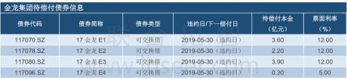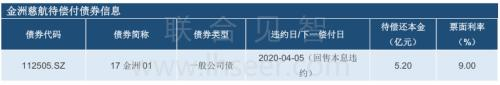 2019年5月15日,因流动资金紧张,金洲慈航未能如期兑付“17金洲01”债券回售本息(合计1.4亿元)。“17金洲01”为金洲慈航目前唯一存续债券,余额5.2亿元,票面利率9%。