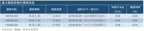 2019年2月20日,庞大集团延期兑付本应于当日兑付的“16庞大03”本息1.19亿元,触发该只债券交叉违约条款,导致该债券加速到期,但未能清偿。