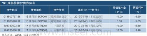 2019年1月15日,因流动紧张,*ST康得未能按期足额偿付“18康得新SCP001”到期本息10.41亿元,构成实质性违约。随后,“18康得新SCP001”未能在1月21日按期兑付到期本息,“17康得新MTN001”、“17康得新MTN002”未能在2月15日和7月14月的付息日按期付息。