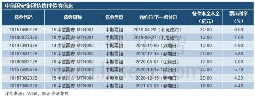 2019年4月28日,中信国安集团未能兑付“15中信国安MTN001”利息,构成实质性违约。该债券系永续中期票据,虽附利息递延支付条款,但由于上市子公司中信国安2018年8月曾派发现金红利,触发债券强制付息事件,使得本次利息未足额兑付的事项直接构成利息兑付违约。