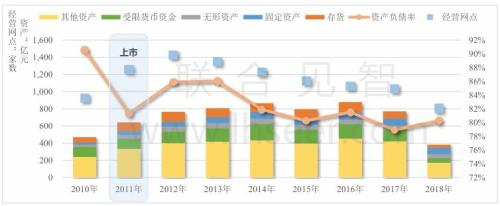 2011~2012年正值货币政策宽松阶段,庞大集团也在彼时进一步加高杠杆大肆购买土地扩充经营网点,2012年负债率再次上升,资产规模也大幅增长,其中以存货(整车等)、固定资产(经营网点房屋等)和无形资产(土地使用权)为主。尽管2014年庞大集团通过定增募集近30亿元的方式再次降低负债率,但仍维持在80%以上的高水平,举债扩张模式导致其在日后宏观降杠杆环境下面临危机。