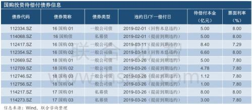 2019年2月1日,国购投资发行的“16国购01”未能按时兑付回售本金及利息,构成实质性违约,并触发另1只私募债“16国购债”的交叉违约条款,而后多只债券加速到期。此前于2018年11月22日面临回售的“16国购债”已被延期。