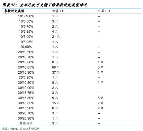 下修条款的设定类型比较多,有21种,其中最主流的设置是20/10,85%和20/10,90%这两类,即在换股期内,当标的股票在任意连续20交易日中至少10个交易日的收盘价低于当期换股价格的85%时/20交易日中至少10个交易日的收盘价低于当期换股价格的85%时,发行人董事会有权决定是否向下修正换股价格。公募EB最喜欢设定的类型是20/10,85%和30/15,80%;私募EB最喜欢设定的类型是20/10,85%。