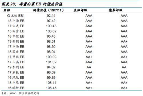 债底是可交债价格绝对的底,投资者可以通过债底或纯债溢价率等指标判断可交债的安全边际。作为价格的组成部分,债底价格(利率水平的波动)的涨跌会影响可交债价格的波动,但这并不是主要影响变量。对于偏股型可交债,债底波动对其影响有限,但利率水平的提升会提高机会成本,降低可交债的投资性价比。目前市场存量的公募EB共15只,债底价格均在90元以上,最高的为18中原EB,债底为106.41元,最低的为G三峡EB1,债底为92.14元。