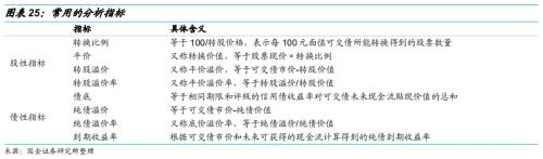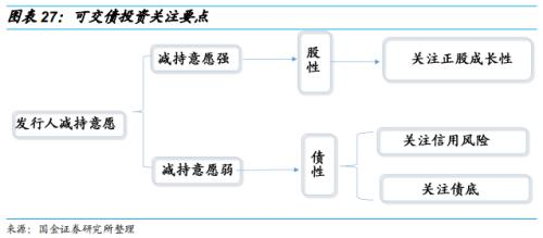 可交换债投资价值分析。1)从正股看中长期价值。正股是影响可交债价格走势的中长期变量。2)从条款看发行人意愿。意愿不可量化,除了同发行人沟通,条款的设定在一定能反映出发行人的“诚意”。换股条款重点关注 初始转股价的设定;回售条款重点关注回售期限、触发条件以及回售价格;赎回条款重点关注是否有换股期前赎回条款;修正条款可以重点关注下修条 款是否容易触发,是否设置自动下修。3)从债底看“底线”价值。债底是 可交债价格绝对的底,投资者可以通过债底或纯债溢价率等指标判断可交债 的安全边际。