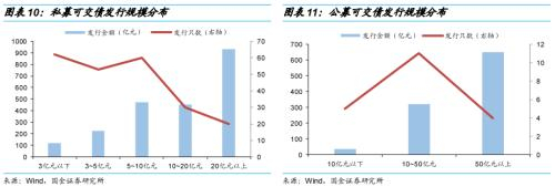 从发行规模的分布来看,私募EB小盘居多,10亿元以下的个券占比为78%,10亿元以上的占比为22%,公募EB的发行规模要高于私募EB,10亿元以下的占比仅为25%。发行规模的大小主要受到发行人负债率、发行人持股市值、可交换债换股后,发行人是否会散失对标的公司控制权等几个因素的影响。