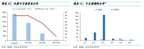 我国可交换债的发行情况。目前我国可交债市场共发行个券 246只,合计发行规模 3,213.09 亿元,存量方面,可交债市场存量规模 2,345 亿元,存量 只数 148 只,由于私募发行灵活性更高,可交债市场仍以私募 EB 为主,公 募 EB 的表现则较为平淡。发行人性质方面,从发行只数上看,民企居多, 国企偏少。从发行规模上看,国企高于民企;从发行规模的分布来看,私募 EB 小盘居多,公募 EB 的发行规模要高于私募 EB;从发行利率来看,公募 EB 要明显低于私募 EB,公募 EB 的发行利率在 0.5%~1.8%之间,而私募 EB 的票息多在 2%~10%之间。