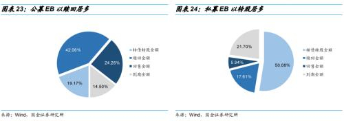 可交换债的退出路径。目前已退市的可交债共 96 只,合计发行总额 763.80 亿元。从生命周期的结束轨迹来看,可交债一半以上均实现转股,有不到 2 成的可交债被发行人赎回,有 1 成不到的可交债被投资者回售,有 2 成以上 的可交债最终被还本付息,以纯债的方式“寿终正寝”。区分公募 EB 和私募 EB 来看,公募 EB 以赎回居多,转股比例较少,而私 募 EB 多以转股结束生命周期。