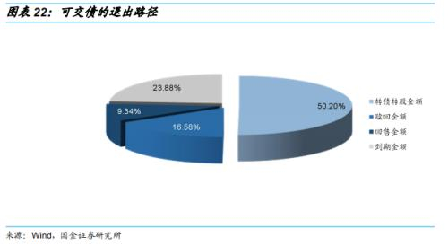 与可交债不同,我们发现存续期转股是转债最主要的退出方式,这反映出转债发行人通常具有较强的促转股意愿,90%的转债转股比例都在95%以上,转债转股是大概率事件。造成这种差异的原因之一是两者发行目的不同。
