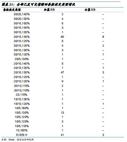 值得说明的是,有两只私募EB不仅设置了下修条款还设置了上修条款,分别是17国轩E2和17国轩E4,上修条款的设定类型为30/15,120%,即在换股期前,当标的股票在任意连续30个交易日中有15个交易日的收盘价高于当期换股价格的120%时,公司执行董事(或执行董事授权人士)有权决定换股价格是否向上修正。另外还有三只私募EB并没有设定具体的触发条件,而是由公司股东会授权公司执行董事根据市场和公司具体情况与承销商协商确定。