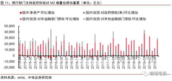 其次,地方专项债发行和财政支出也是重要的边际变量。同国债购买不同,商业银行配置地方政府专项债可以直接形成信用扩张(配置国债的资金须经过财政支出财政形成M2)。目前地方专项债发行逐渐提速,而商业银行对地方政府债的配置也显得更加积极。由于国债募得资金须统一存放国库,故而财政支出节奏对未来M2增量也起到非常重要的作用。2019年6月一般公共预算支出同比增长5.6%,高于上个月3.5个百分点;上半年财政支出增速为10.7%,低于一季度支出增速4.3个百分点,目前财政政策“减税费+宽财政”的组合使得财政扩张有短暂反复的可能。