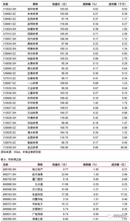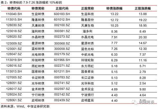 从两个角度进行验证,第一个角度从触发提前赎回的视角看,7月以来宁行与生益转债陆续触发赎回,而隆基、天康以及平银转债等品种后续近期触发提前赎回条款的概率也较大,上述标的正股基本属于细分领域龙头或正处于业绩景气周期内,反观上半年触发提前赎回条款的标的正股中有相当一部分是基于市场短期热点或市场整体beta行情推动,从资质对比来看当前触发提前赎回条款标的的质量更胜一筹;第二角度从近期涨跌幅来看,6月底市场弱beta修复持续至7月第一周,7月8日市场调整为结束的标志,我们统计7月8日收盘至7月26日收盘涨跌幅位于前10%的标的,从下表依旧可以发现多数标的正股享有细分领域龙头地位。虽然转债个券的涨跌幅与正股涨跌幅之间依旧存在差异,但总体正股涨幅也位于同期前列。
