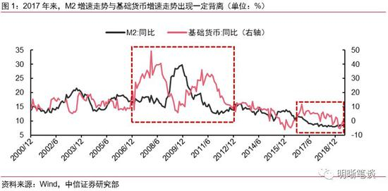 2019年7月15日,人民银行公布6月广义货币(M2)分项数据以及货币当局资产负债表。6月M2同比增速收8.5%,连续23个月维持在8.0%-9.0%区间;储备货币(基础货币)同比减少1.69%,已负增长5个月。回顾曾经的基础货币与M2增速走势,我们可以发现自2017年以来,中国M2增速走势与基础货币增速走势出现一定的背离。