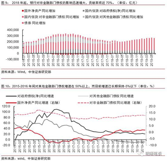 银行对非金融部门信贷和购置政府债券的行为已经成为M2扩张的主力。2016-2018年间,贸易环境的恶化导致了银行国外净资产的下滑,同时2018年开始的金融去杠杆行动极大的压缩了银行部门对非银金融部门的信贷投放(2016年,对非银部门贷款高峰时贡献了30%M2增量,而目前对非银金融部门信贷已经连续13个月负增长)。2018年起,银行对非金融部门债权的影响迅速增大,贡献率将近70%。从同比增速来看,2015-2016年间银行对其他金融部门债权增速在50%以上,而目前该项增速已经长期保持-5%以下。与此同时,银行部门对实体经济部门提供信用(包含放贷、购买企业债券)则提供了主要的同比增量;银行部门对政府部门提供信用(主要来源于购买国债以及地方政府债券)也有着约21%的增速,提供约50,000亿元的M2同比增量。