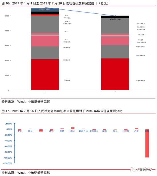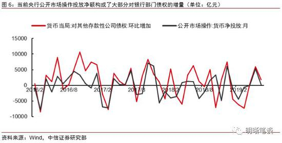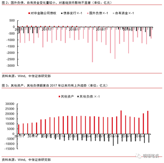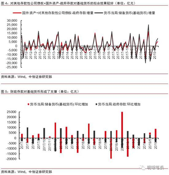 对其他金融性公司债权、债权发行等项波动较小,其他资产负债项有上升趋势。由于央行对政府债权自2007年购买特别国债后一直保持稳定(目前余额稳定于15,250.25亿元),故而我们认为其并非基础货币变动的原因。考察央行对其他金融性公司债权的变动,该项主要记录央行为了金融稳定而开展的对非银金融机构的再贷款,其三次大规模的增量均源于特定的金融事件(1999-2000年和2004-2007年定向支持四大资产管理公司处置银行不良债务,2015年为救市向证金公司再贷款),目前其余额也随着贷款到期而缓慢减小。同时央行对非金融部门债权额度相对基础货币余额极小,目前仅余额约27亿元;央行“债权发行”项目主要记录央行发行央行票据的余额规模,该项在中国贸易结汇额高增期起到了回收基础货币的作用,但目前三点原因导致其已经成为较少使用的货币政策工具:一来中国贸易外汇流入额度已有减小;二来强制结售汇制度也在逐渐放松,“藏汇于民”逐步推进;三来央行票据的发行有较大的货币政策成本,同时推测该项6月的变动主要由央行在港发行300亿元离岸央票引起。其余某些项目例如国外负债、自有资金存量或变化量较小,对基础货币影响也并不显著。而其他资产、其他负债项虽然额度较大,但目前其变动还缺乏一个公开的信息来源说明项目所包含的具体内容,我们可以观察到其他资产&负债每逢季末可能有较大动作,同时二者额度自2017年以来均有上升趋势,我们预计二者的变动可能仍将呈现稳步上升的趋势。