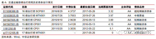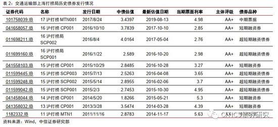 三家打捞局的历史债券发行总额平均81.3亿元,期限平均1.36年。我们分别梳理了上海、烟台和广州打捞局的历史债券发行情况,其中上海打捞局历史发行额最大,达到66.5亿元,烟台打捞局历史发行额12.8亿元,广州打捞局只有一只历史债券、额度2亿元。打捞局历史发行债券平均期限为1.36年,烟台打捞局期限最长为1.62年。目前只有上海打捞局还有存续债券,为2017年8月发行的17沪打捞MTN001,余额8亿,剩余期限1.07年。