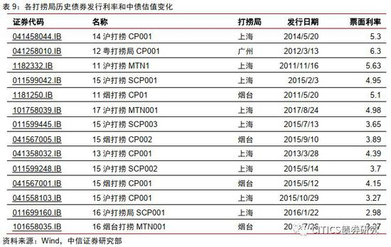 打捞局债券性价比较高,历史估值收益明显。从各打捞局历史债券发行利率和中债估值变化来看,大部分打捞局债券在发行后收益率都有一定程度的下降,差值收益明显。其中上海打捞局发行的14沪打捞CP001曾在发行一年后估值下降347bps。