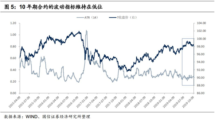在持仓量上升的影响方面,我们认为当前国债期货持仓量的上升可能会加大后续债市的波动。近期,国债期货的持仓量不断上升,而国债期货价格波动却不大,根据ATR指标来看,10年期国债期货价格的波动指标一直维持在低位。这说明有相当部分的投资者分歧较大,即又有做多力量又有做空力量的参与,使得国债期货在持仓量上升明显的同时,但价格波动却不大。这样一来,如果后续债券市场选择了方向,那么很有可能出现投资者大量止损的情况,并进一步加大行情演变的幅度。
