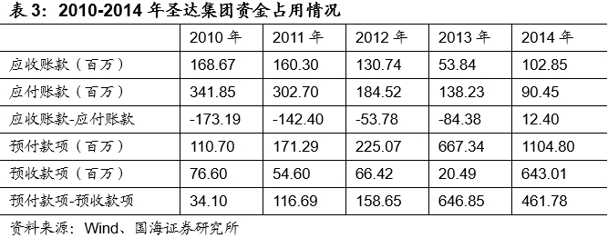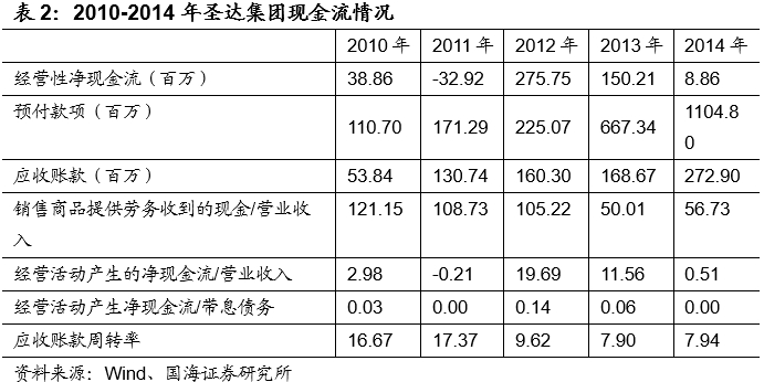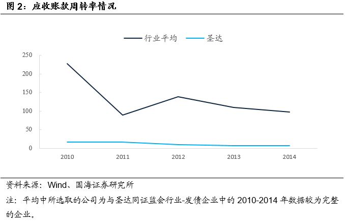圣达的资金压力直接表现为财务指标的恶化。2013年、2014年公司收现比从2012年的1.05下降到0.5左右,主要是采购和销售中采用票据结算的力度加大。公司将客户的票据背书后直接用于采购,营运资金压力加大。2014年预付款项和应收账款大幅上涨,前者是由于公司采购货物时形成的预付款,后者则是在销售制动鼓时采用了先货后款的结算方式进行赊销所形成的应收款,同时,由于采购和销售结算方式的不同,公司回款速度不断下降,应收账款周转率从2010年的16.67下降到2014年的7.94,并且远低于行业平均水平。公司的经营性净现金流也很不稳定,总体呈现下降趋势,从2010年末的3885.78万元下降到2014年末的885.73万元,公司获得现金流的能力下降严重。
