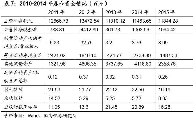 春和外部融资能力明显受限,受经营亏损导致整体财务状况恶化影响,公司资金链十分紧张,发生多项银行融资款逾期情况。自2013年起公司筹资活动现金流一直为负值,2015年筹资活动现金流净额为-14.87亿元,约45亿元的银行融资处于逾期状态,并产生欠息2561.11万元,公司整体资金链非常紧张,现金流已经枯竭。