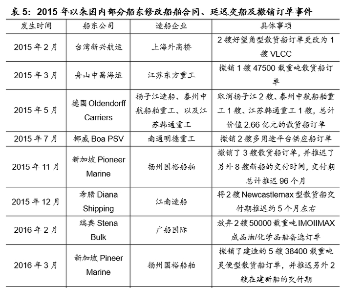 由于散货船价格下跌幅度最大,散货船船东出现上述情况最为多见,上表统计了2015年以来国内部分船东修改订单的事件,船企面临的经营风险明显上升,流动性压力大。2015年春和新增订单的预付款平均水平不足30%,公司船舶制造业务需要垫付大量资金。