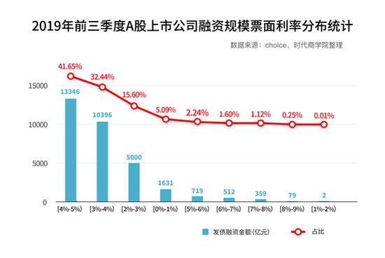 按票面利率划分,2019年前三季度A股上市公司发行的债券可划分为9个区间,如下: