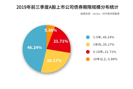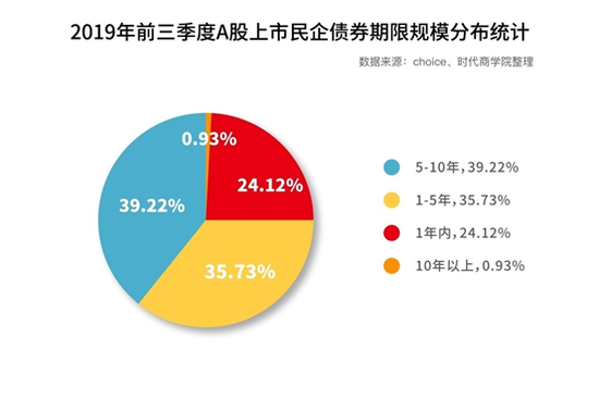 时代商学院统计,2019年前三季度A股上市民企中,期限为1年内的债券融资规模合计727亿元,占比0.93%;期限为1-5年(包含5年)的债券融资规模合计1077亿元,占比35.73%;期限为5-10年(不包含5年)的债券融资规模合计1181亿元,占比39.22%;期限为10年以上的债券融资规模合计28亿元,占比0.93%,目前上市公司发行长期债券的还是少数。
