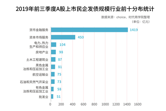 时代商学院统计发现,2017-2019年三季度,非金融A股上市民企的发债融资额占比分别为74.89%、73.75%和51.46%,逐年下滑。2019年前三季度,非金融A股上市民企的发债融资额合计1551亿元,同比下滑31.97%。