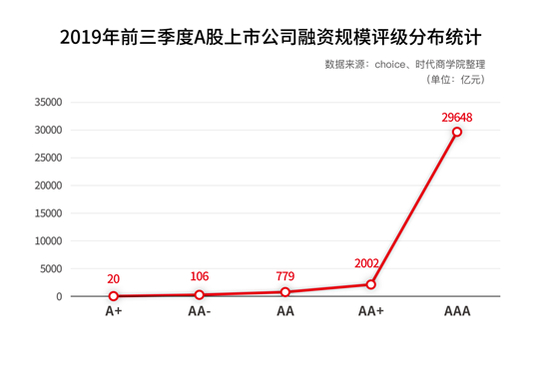 其中,2019年前三季度,发债主体评级为AAA的上市公司发债金额合计29648亿元,占A股上市公司发债总金额的比重达90.88%;发债主体评级为AA+的上市公司发债金额合计2002亿元,占比6.14%;发债主体评级为AA的上市公司发债金额合计779亿元,占比2.39%;发债主体评级为A+的上市公司发债金额合计20亿元,占比0.06%(部分公司没有评级信息,不纳入此次统计范围内)。