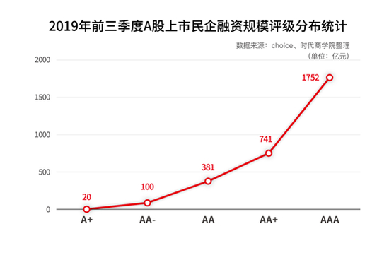 经时代商学院统计,2019年前三季度A股上市民企中,发债主体评级为AAA的上市公司发债金额合计1752亿元,占A股上市民企发债总金额的比重为58.13%;发债主体评级为AA+的上市公司发债金额合计741亿元,占比24.59%;发债主体评级为AA的上市公司发债金额合计381亿元,占比12.64%;发债主体评级为A+的上市公司发债金额合计20亿元,占比0.66%(部分公司没有评级信息,不纳入此次统计范围内)。