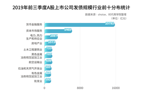 从发债规模来看,A股上市公司发债融资主要集中在货币金融服务、资本市场服务、电力、热力生产和供应业、房地产业和土木工程建筑业等行业,发债规模排名前十行业的上市公司涉及发债总额合计28339亿元,占比达86.86%。