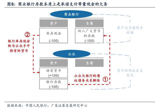 不同于拿现金购买基金份额等其他金融资产,“存钱”(或者“取钱”)前后,货币持有者依然保留交易支付能力,因为银行存款可以完成直接支付,这一点其他金融资产无法实现的。对持有货币部门而言,不考虑银行破产等极端情况下现金和银行存款可以等价转换,即银行信用和国家信用可以等价转化。