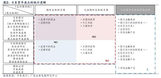 日本的货币层次划分性更为复杂,分为M1、M2、M3和L四层。日本M1层次与美国相近,也与中国类似,主要包括流通中的现金和活期存款。日本M2主要包括银行机构发行的定期存款、外汇存款和大额存款。有意思的是,日本的M2指标并不完全包含M1。此外,日本还有M3货币层次。相较M2,M3主要是在发行主体层面进行扩展。M3扩展至其他存款机构发行的活期、定期、外汇和大额存款。最后,日本央行还统计了代表广义流动性的L,主要包括以证券形式发行的金融和其他机构负债,如银行金融债券、金钱信托、政府债券等。