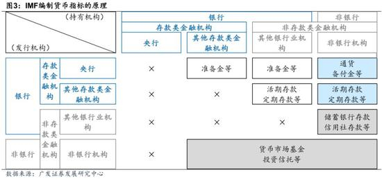 以三因素框架编制货币指标,IMF最终筛选出来的是特定部门持有的高流动性金融资产。IMF编制货币指标实际上是建立在《国民账户体系》(SNA,system of national account)基础之上。《国民账户体系》是一套统计规范,旨在刻画一国经济体中不同的部门如何参与生产、分配等经济活动,当然也刻画不同部门之间的金融行为。可以说SNA已经清晰界定并归类了目前经济运行过程中不同部门、不同部门之间的经济行为、不同类型金融资产。流动性较高资产能迅速影响当期价格,对当期经济产生较为直接的影响。为了捕捉流动性较高资产表现,IMF以SNA体系为基础,根据特定条件[5]框定出高流动性资产,从而为货币政策提供参考。某种程度上可以认为IMF编制的货币指标,指向的就是高流动性金融资产。