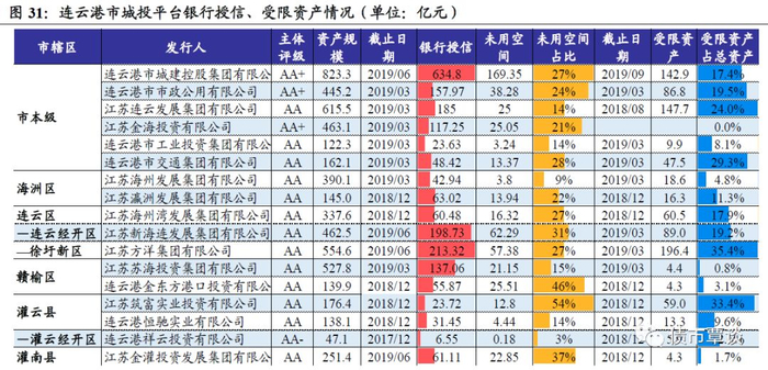 银行授信金额和可使用空间,侧面反映出金融机构对一家企业的认可和备用流动性支持情况。而受限资产规模和占总资产比重,也是反映企业资产流动性状况和可再融资空间的一个有效指标。我们根据评级报告等,汇总了连云港市城投平台最新银行授信、未使用额度、受限资产情况。